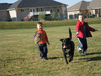 It was a fun day despite the lack of candy. We went outside and kicked the ball around. wg3 threw his ball over the wall. We retrieved it once. He threw it over again. As I went to lower wg3 over the wall the dogs came out. wg3 sat on the wall with his feet hanging over. I'll be darned if the big one didn't jump up and just nip the end of his toe. Grrrr. I'd like to make a hot dog out of the little rat. Fortunately, it was only a flesh wound. And not a Black Knight style either. Wg3 didn't even cry, but there was a little blood.